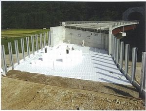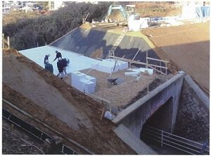 ロックシェッドやトンネル坑口部の上部にEDO-EPSブロックを設置し、落石による衝撃を緩和低減します。