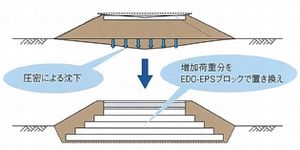 軟弱地盤上の盛土にEDO-EPSブロックを併用し荷重増加を抑え、沈下を防止します。