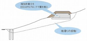 地すべり地盤頭部の盛土にEDO-EPSブロックを併用し荷重増加を抑え、地すべりの誘発を防止します。