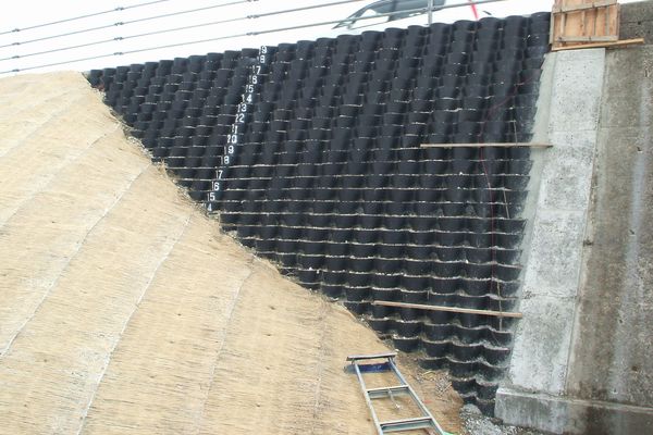 壁面勾配1:0.1~1.0で壁高8mまでの高さに対応可能で、現地の状況に合わせた曲線部の施工や勾配の変化も容易に対応できます。またフレキシブルな材料のため、基礎コンクリートが不要で、ある程度の地盤の不同沈下にも追従します。