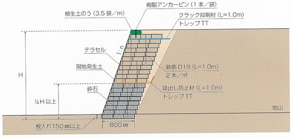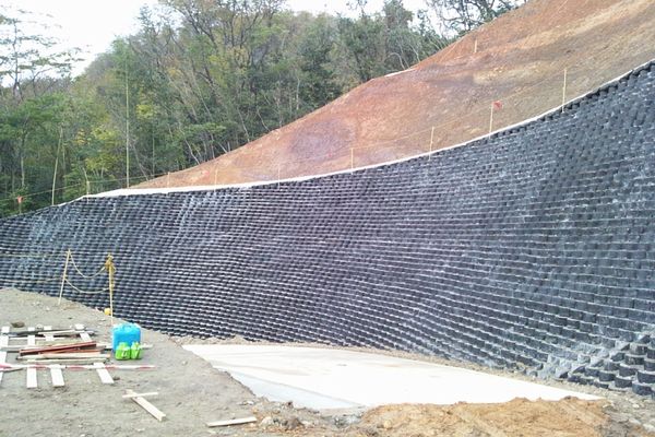 展開したテラセル(ジオセル)に現地発生土や砕石を充填し、段積みすることで擁壁を構築し、切土法面を保護する工法です。