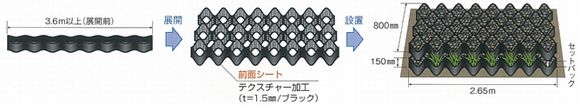 テラセルの原材料は高密度ポリエチレンを使用し、表面のシートには暑さ1.5mmのテクスチャー加工を施したシートを使用しているため、十分な耐候性を持っています。また、耐薬品性にも優れており、酸性土、アルカリ性土などあらゆる土壌に適応します。